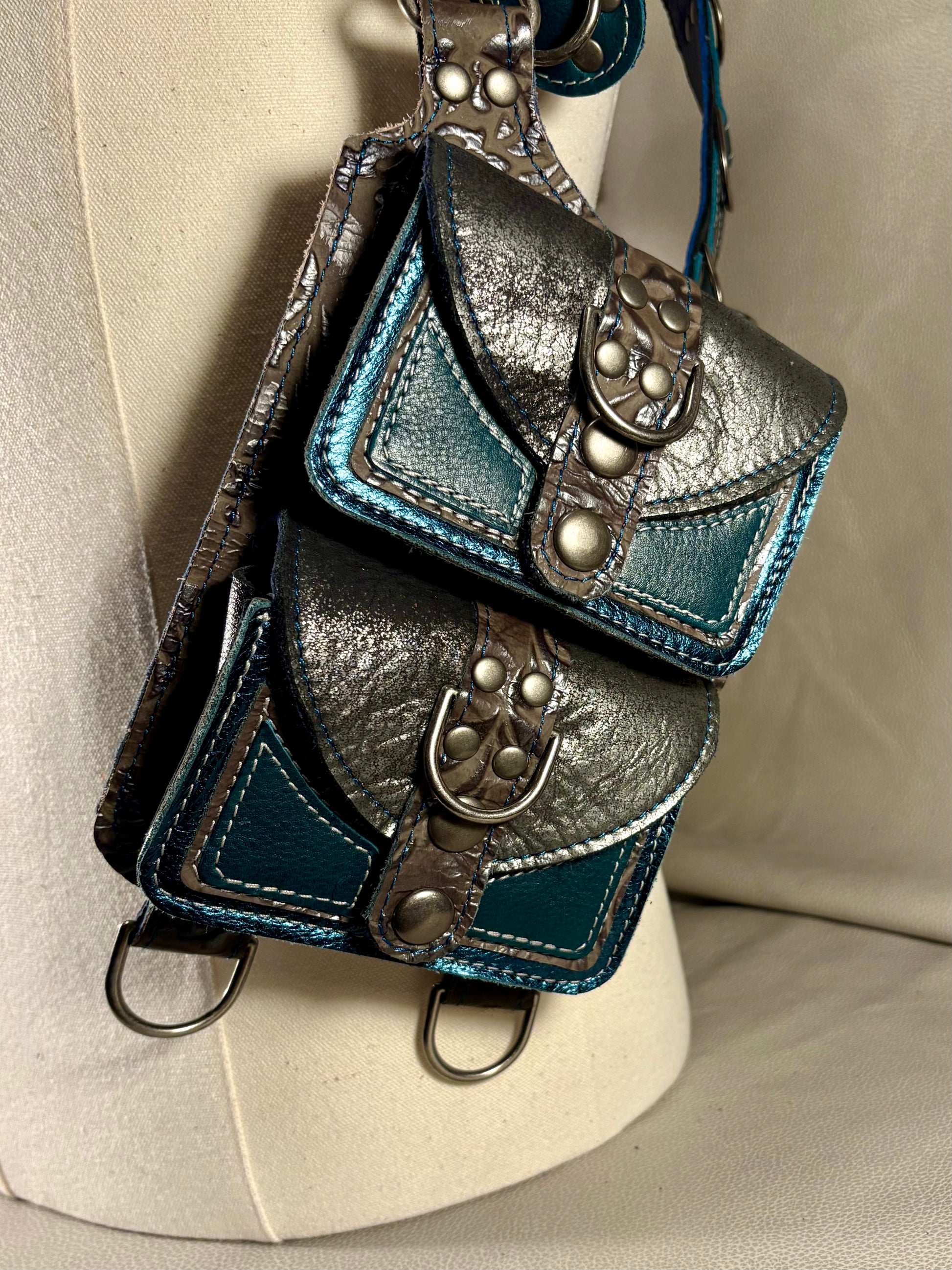 The lobster clasps can also be used to adjust the angle of the pockets and enable the wearer to remove the holster quickly and easily without shoulder contortions. Each of our holsters feature 24 weight bearing D-rings, any of which can easily hold a full water bottle. (Though we don’t recommend hanging your water bottle from the pocket flaps; save those ones for lighter, more decorative items to avoid distorting the shape of your pockets.)