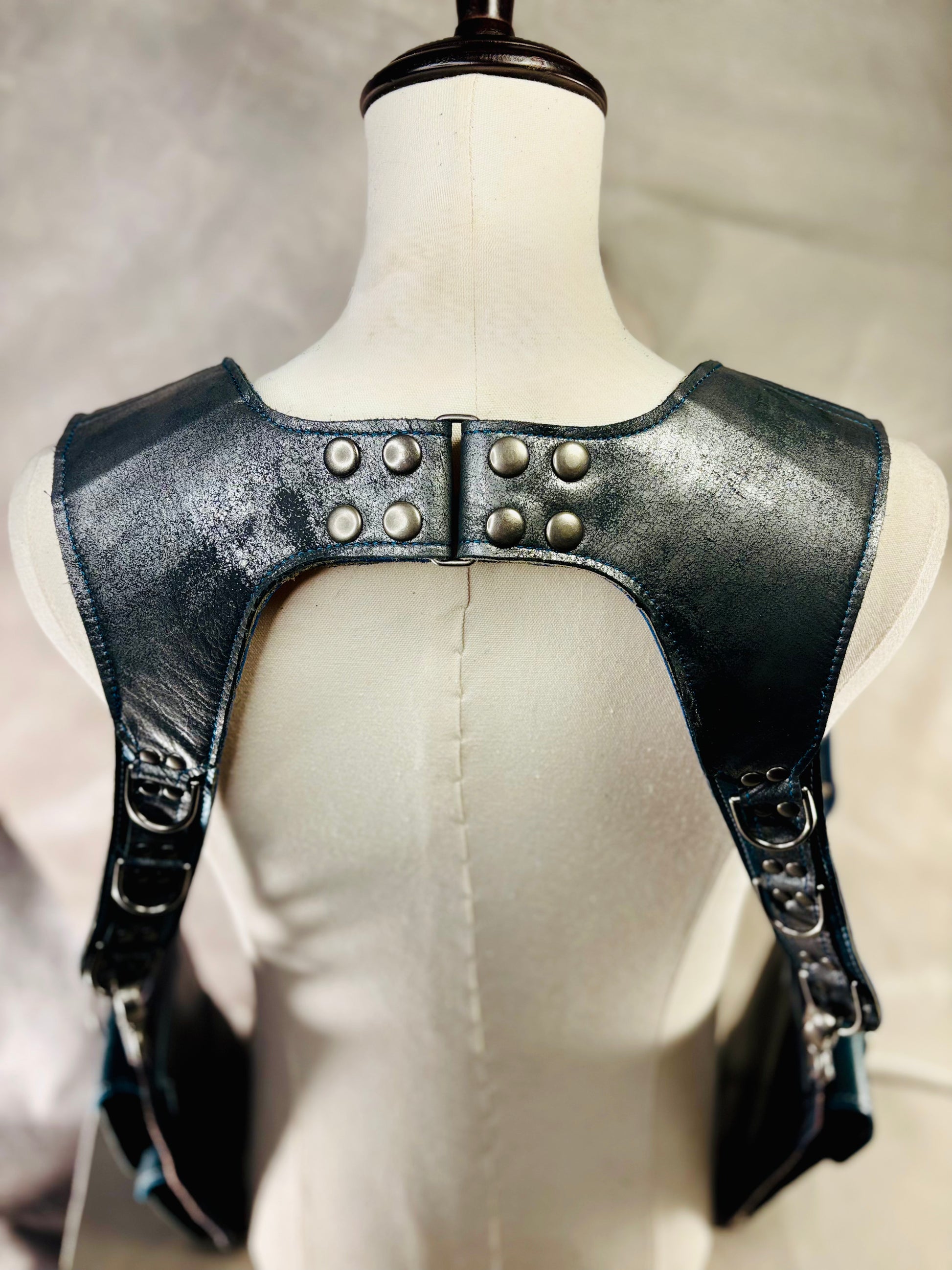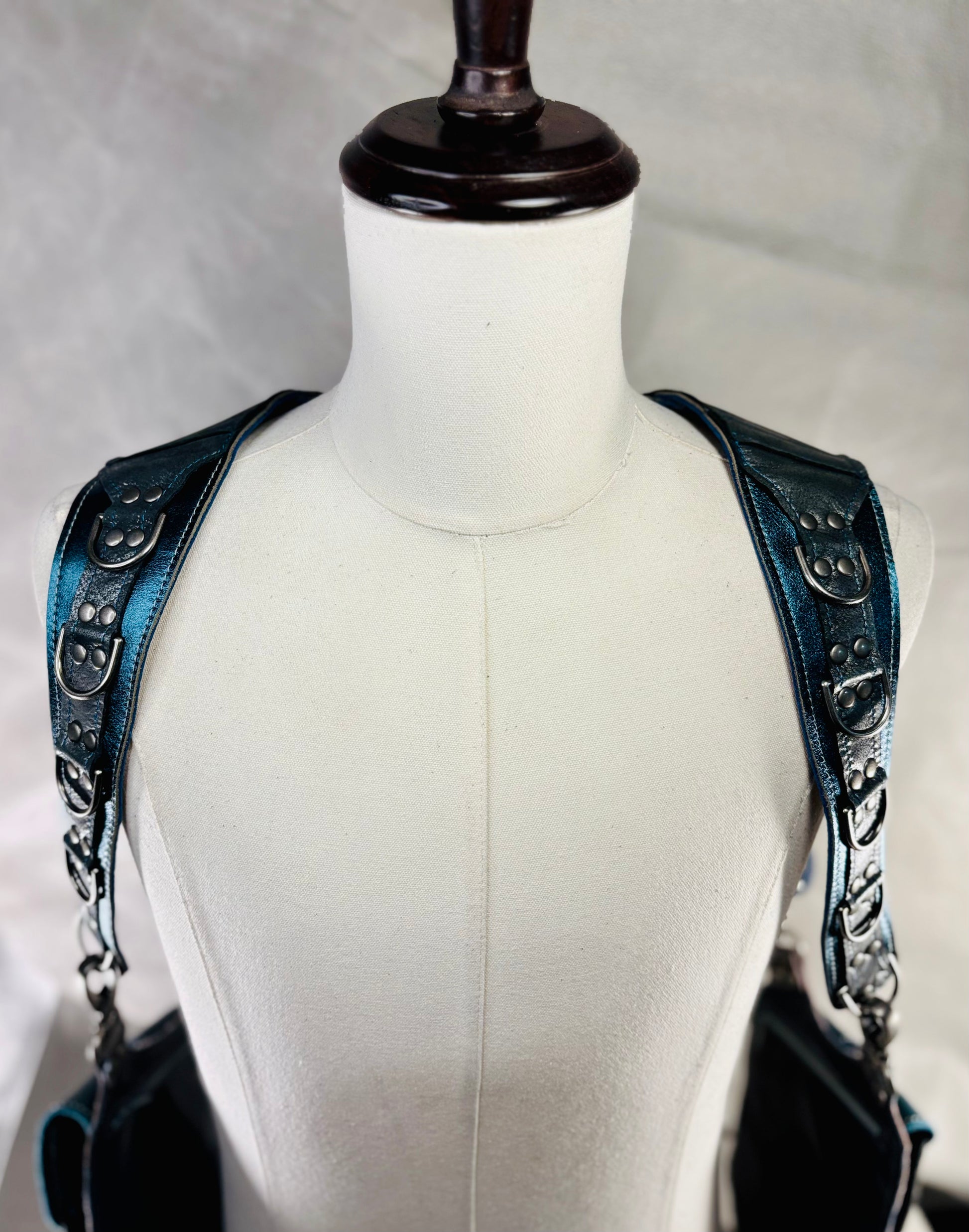 The lobster clasps can also be used to adjust the angle of the pockets and enable the wearer to remove the holster quickly and easily without shoulder contortions. Each of our holsters feature 24 weight bearing D-rings, any of which can easily hold a full water bottle. (Though we don’t recommend hanging your water bottle from the pocket flaps; save those ones for lighter, more decorative items to avoid distorting the shape of your pockets.)