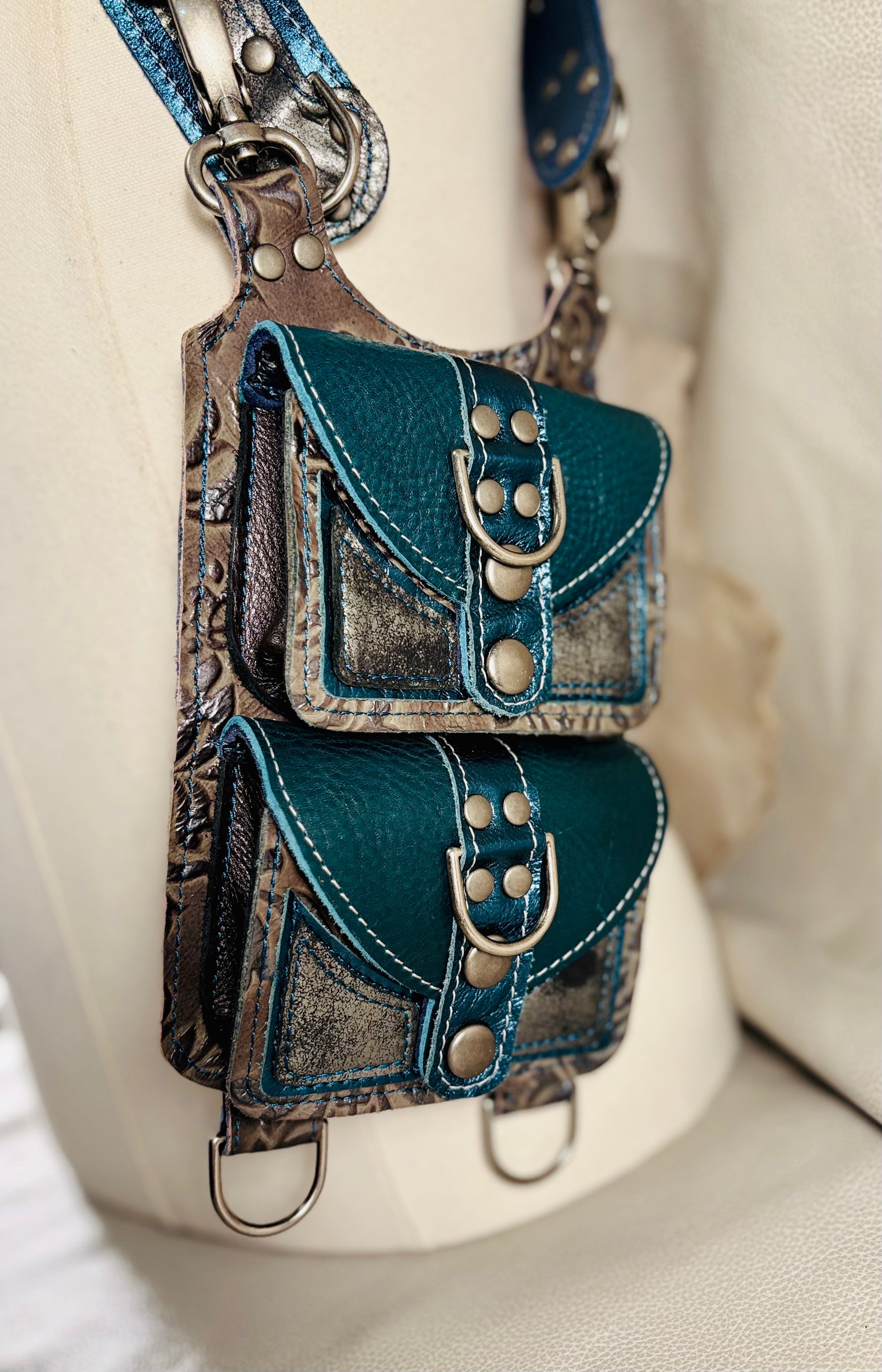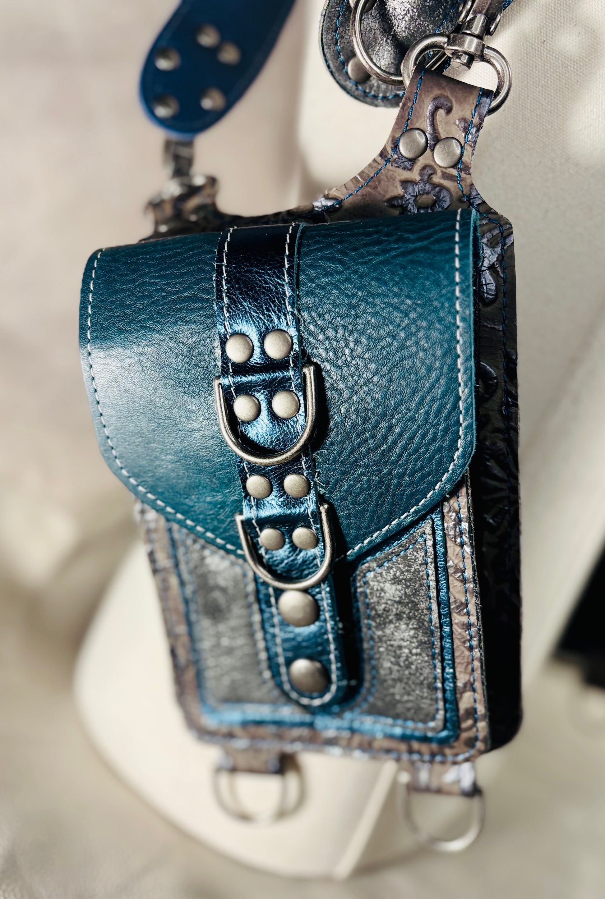 A grey and silver damask is the star of this collection paired with deep teals and pewter hardware. Though the color palette is simple, the textural differences in each of the leathers is what really makes these pieces special.