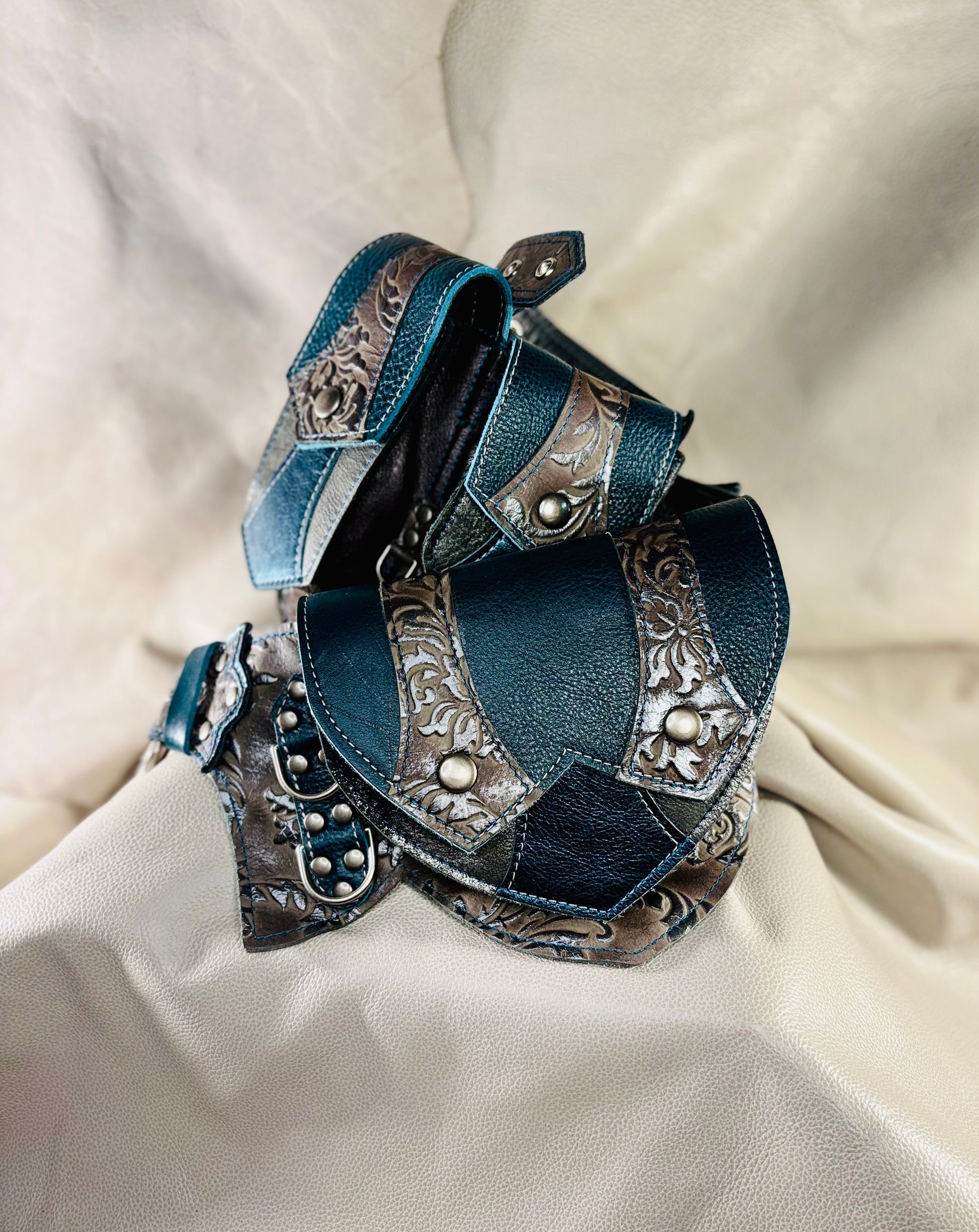 The Regal Belt is our signature utility belt ideal for adventures of all kinds from Burning Man, to Ren Faires, and Cons, to concerts, hiking, and running errands. One side has a single big pocket, ideal for a larger phone or A6 notebook, while the other side has three smaller pockets (the center one is sized for an iPhone) which can hold a variety of necessities such as card wallets, keys, earbuds, pocket knives, lip balms, etc.