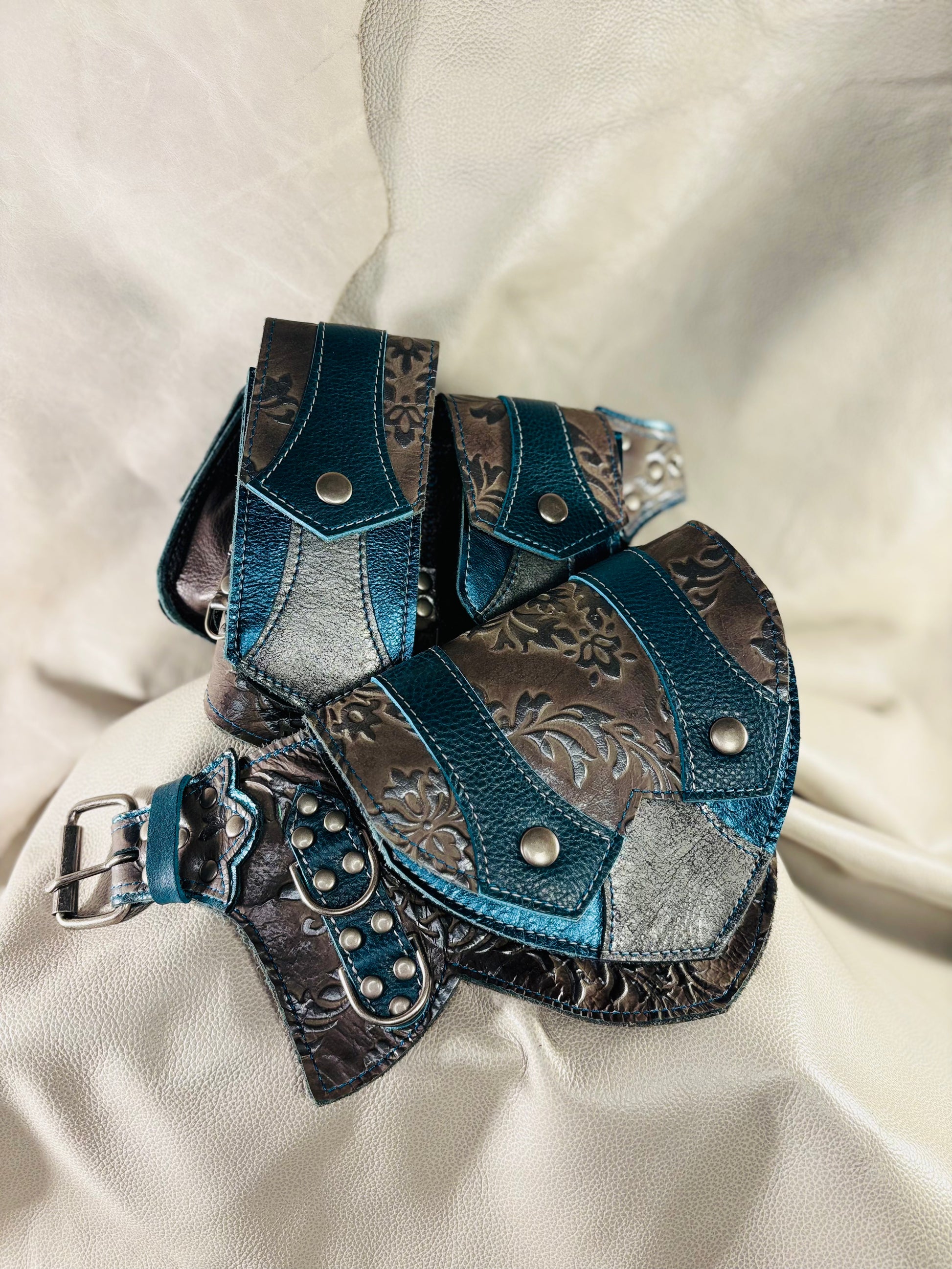 The Regal Belt is our signature utility belt ideal for adventures of all kinds from Burning Man, to Ren Faires, and Cons, to concerts, hiking, and running errands. One side has a single big pocket, ideal for a larger phone or A6 notebook, while the other side has three smaller pockets (the center one is sized for an iPhone) which can hold a variety of necessities such as card wallets, keys, earbuds, pocket knives, lip balms, etc.