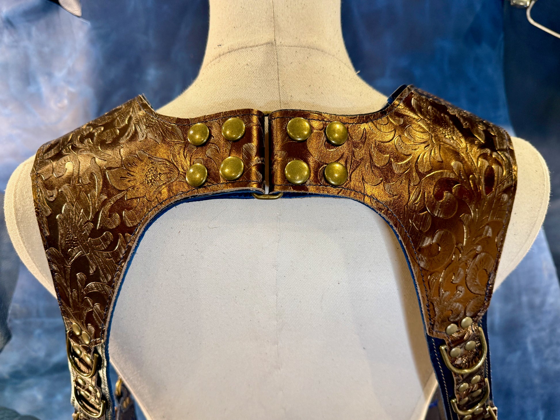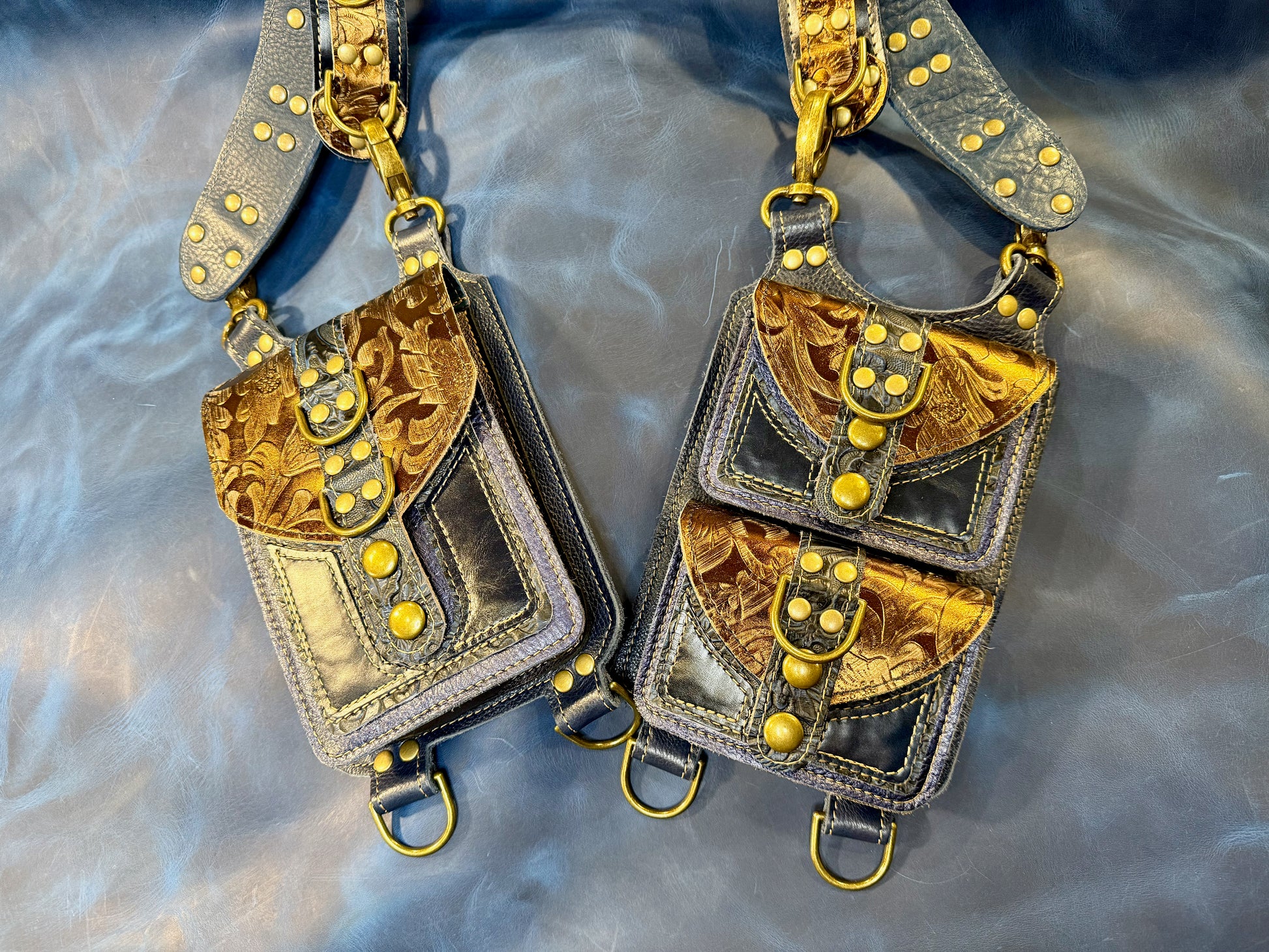 Galahad is an elegant deep blue and bronze combo that evokes the richness of medieval tapestries while still remaining modern. The embossed floral printed leather has an irregular bronze brush that will patina over time adding to the unique character of each piece as it is worn. The blues used have three different textures, (glazed, light metallic, and smooth aniline gloss) for a colorway with *just enough* shine and texture.