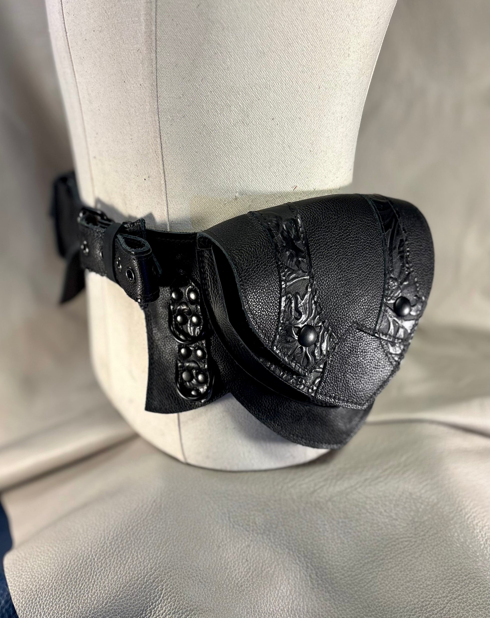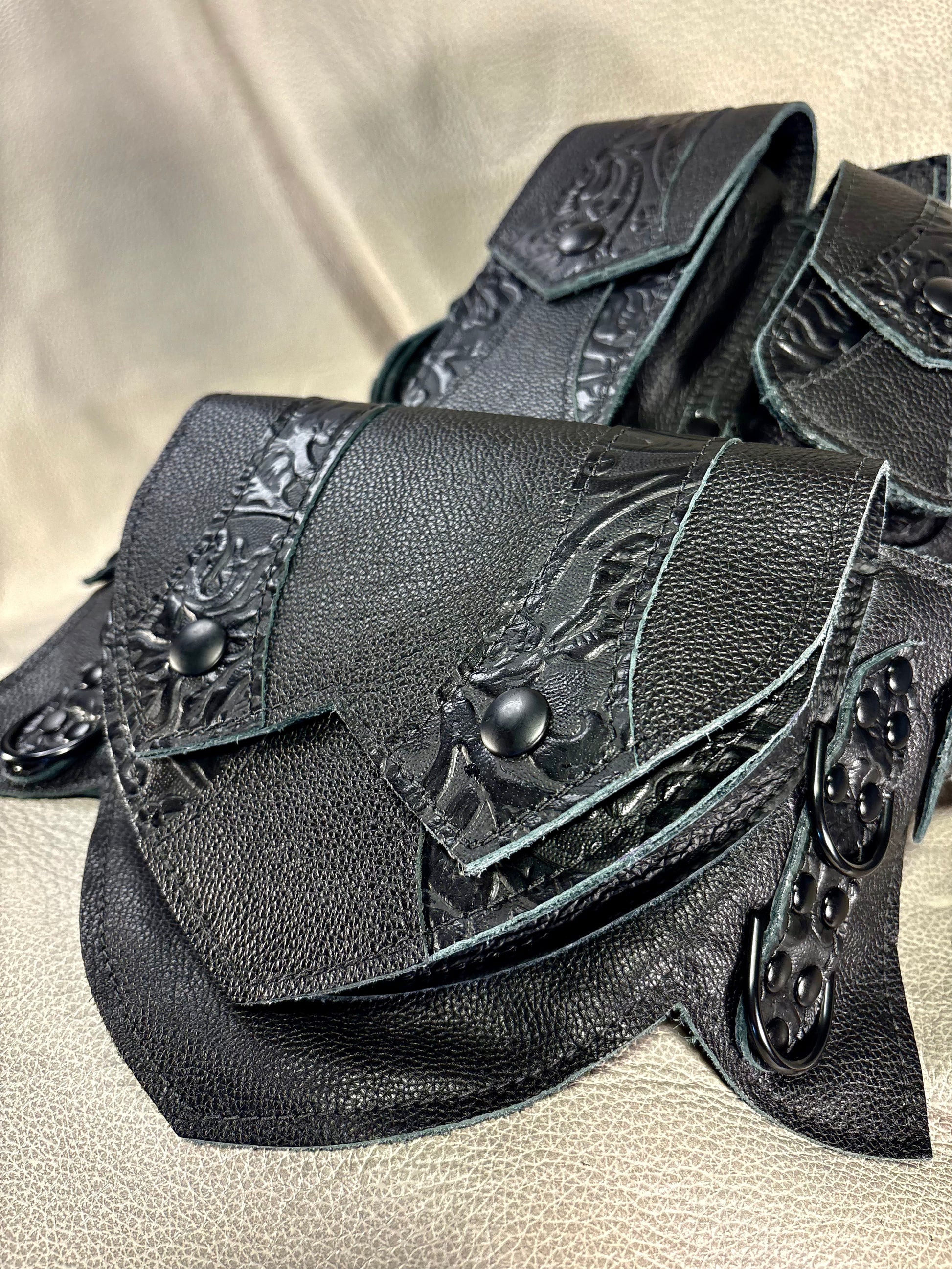 The Regal Belt is our signature utility belt ideal for adventures of all kinds from Burning Man, to Ren Faires, and Cons, to concerts, hiking, and running errands. One side has a single big pocket, ideal for a larger phone or A6 notebook, while the other side has three smaller pockets (the center one is sized for an iPhone) which can hold a variety of necessities such as card wallets, keys, earbuds, pocket knives, lip balms, etc.