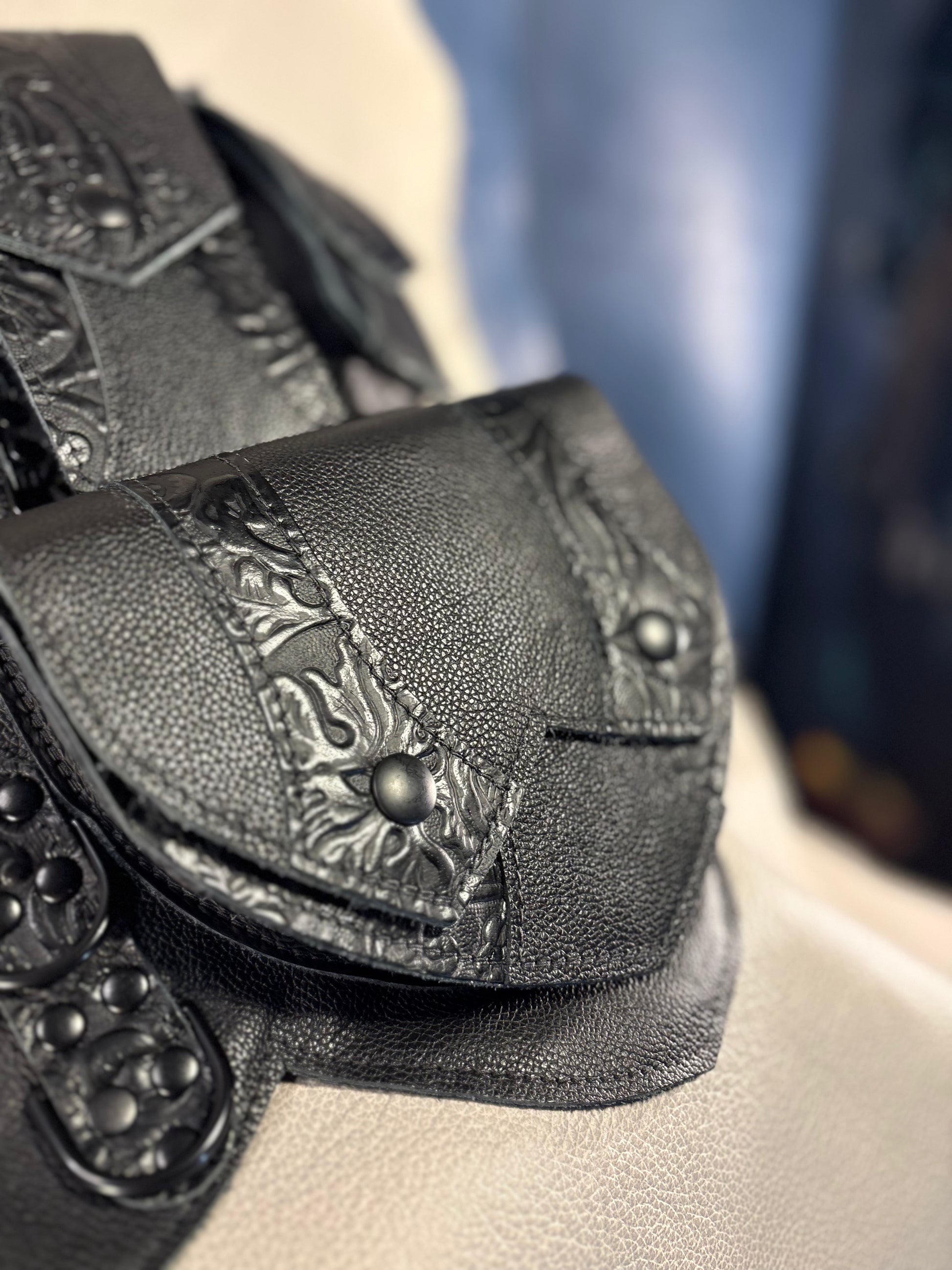 Footlight style means that the featured leather (in this case, the Gothika Black) is used as accents on the flaps of the Regal belt and for the main body of the pocket fronts, a style which utilizes the textured elements more subtly.