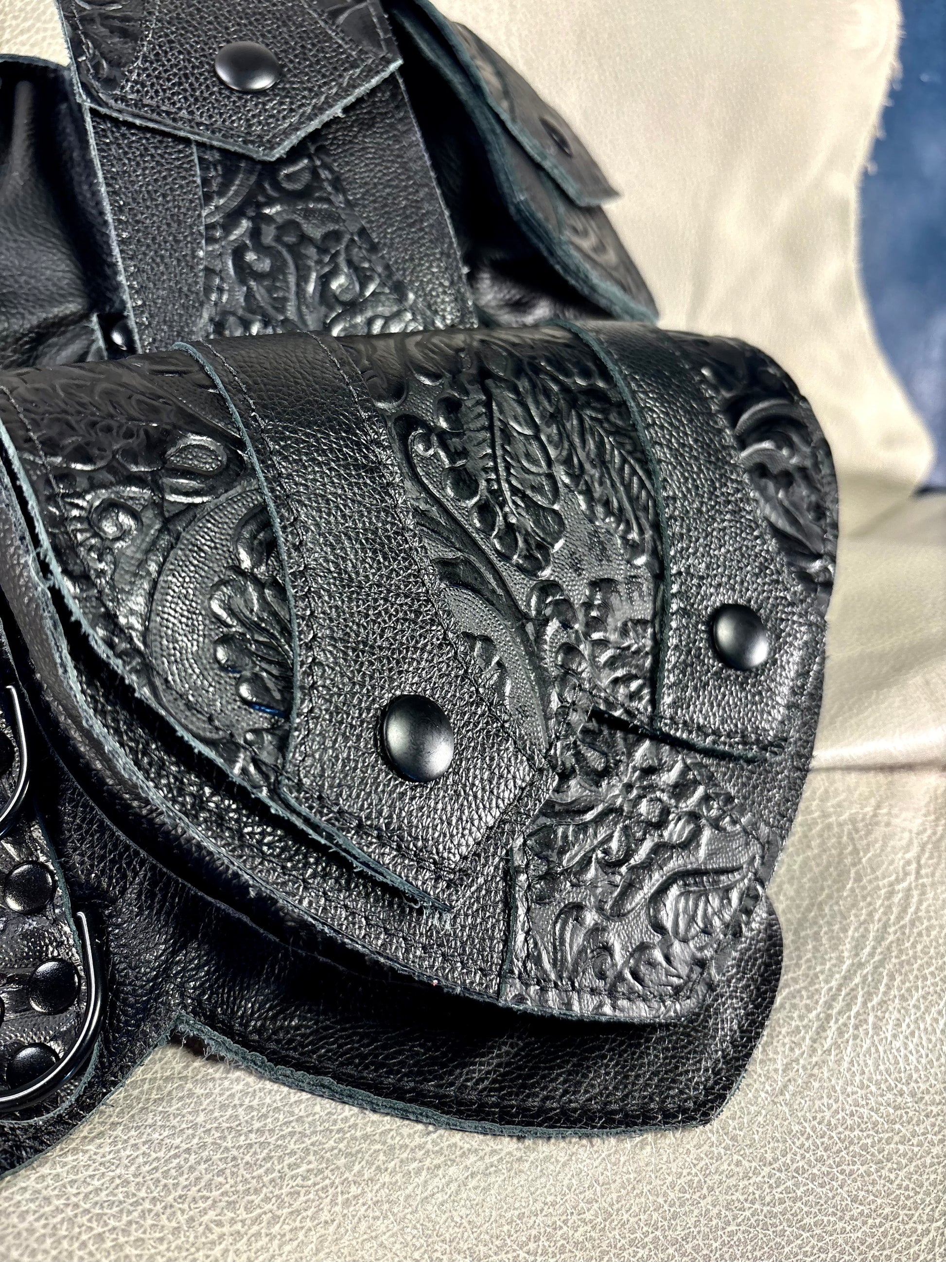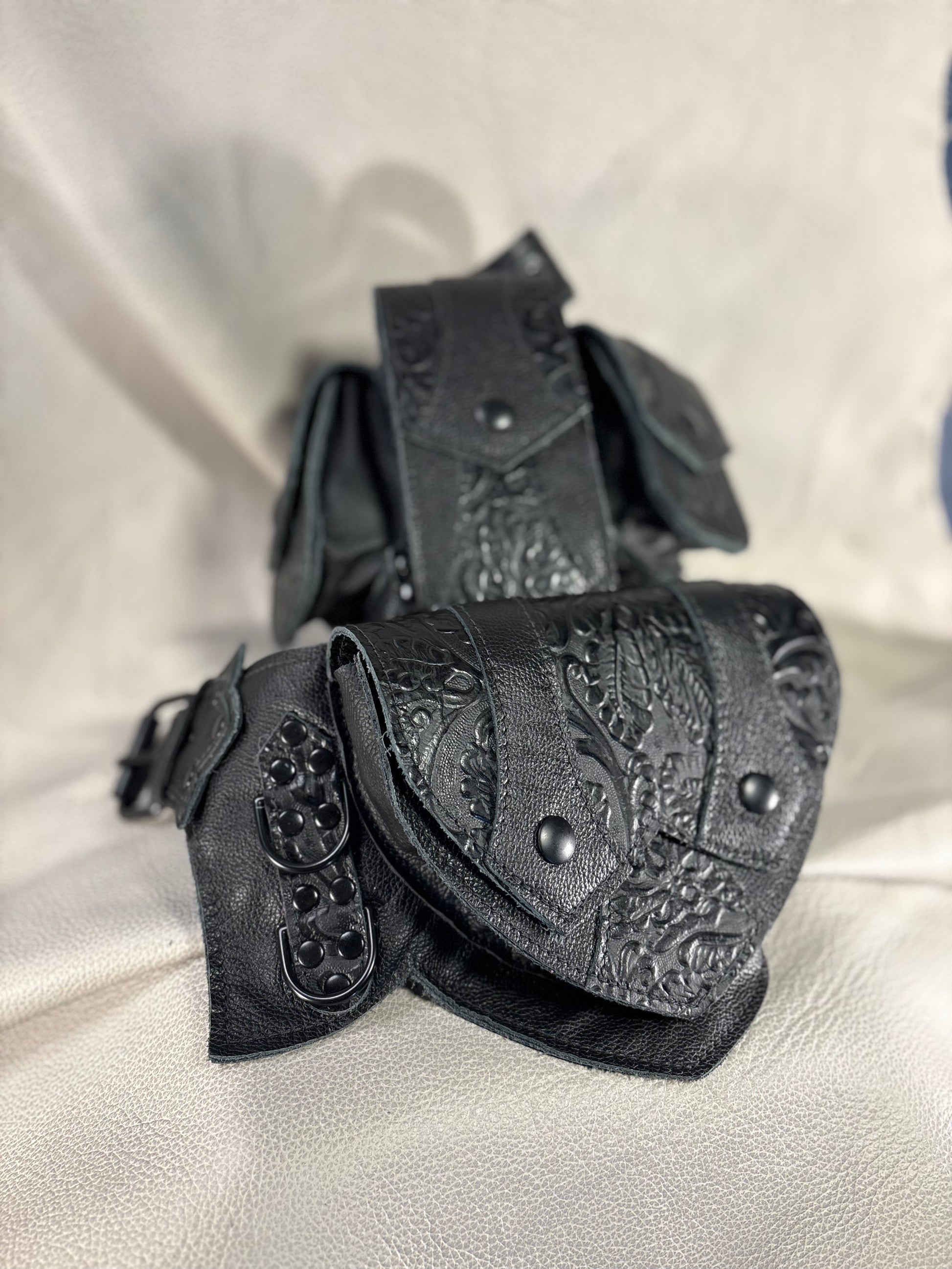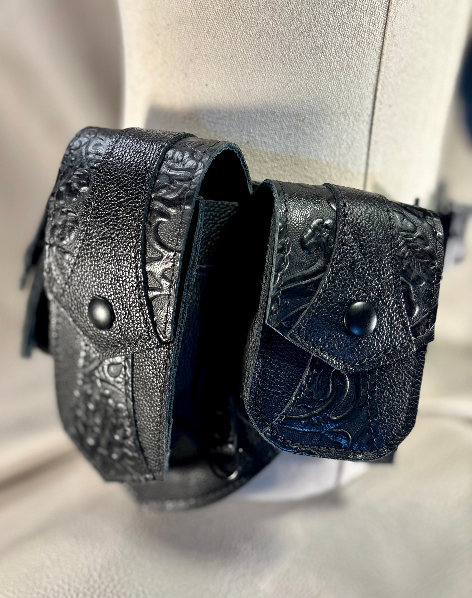The Regal Belt is our signature utility belt ideal for adventures of all kinds from Burning Man, to Ren Faires, and Cons, to concerts, hiking, and running errands. One side has a single big pocket, ideal for a larger phone or A6 notebook, while the other side has three smaller pockets (the center one is sized for an iPhone) which can hold a variety of necessities such as card wallets, keys, earbuds, pocket knives, lip balms, etc.