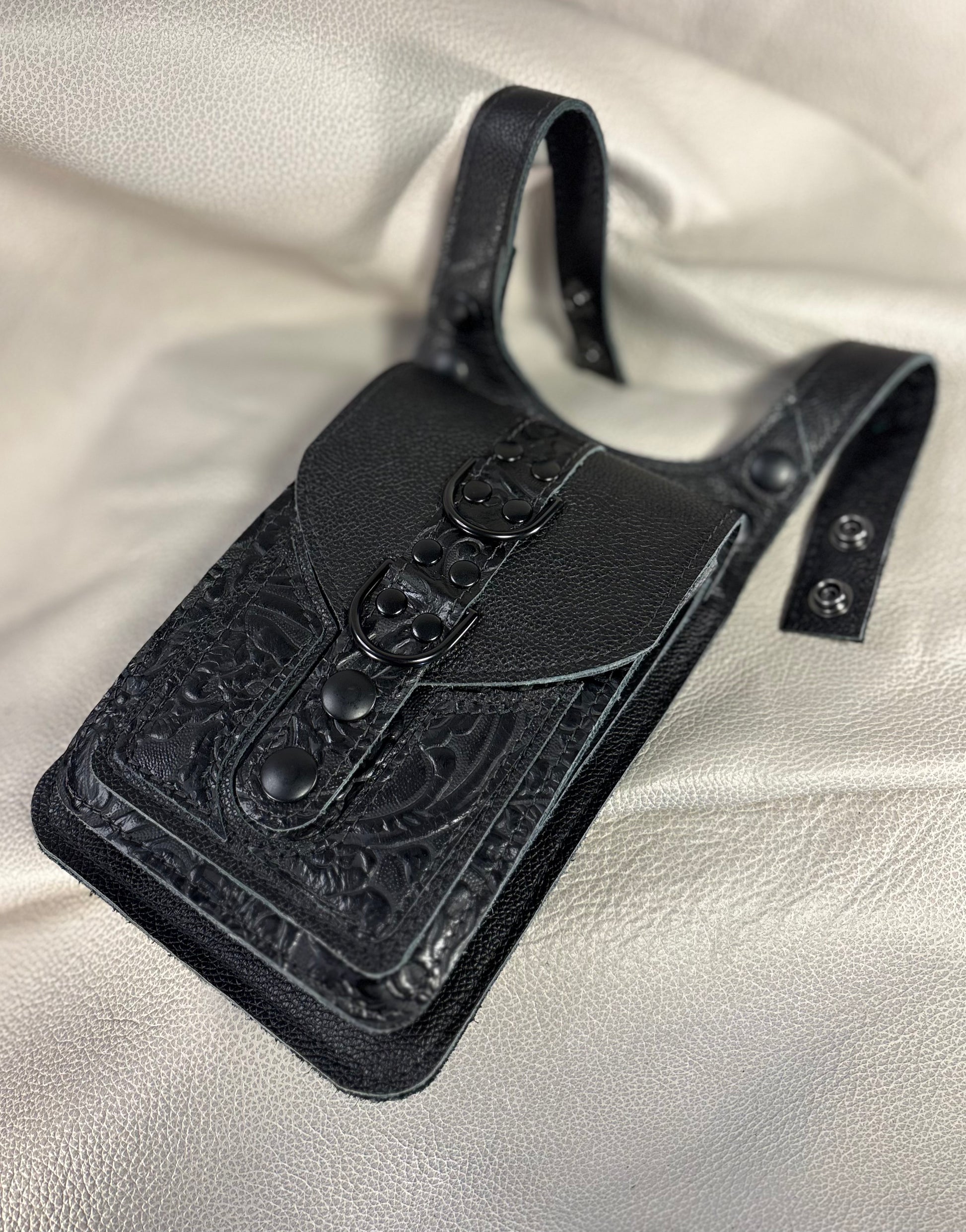 Footlight style means that the featured leather (in this case, the Gothika Black) is used as an accent on the flap of the thigh bag, and for the main body of the pocket front, a style which utilizes the textured elements more subtly.