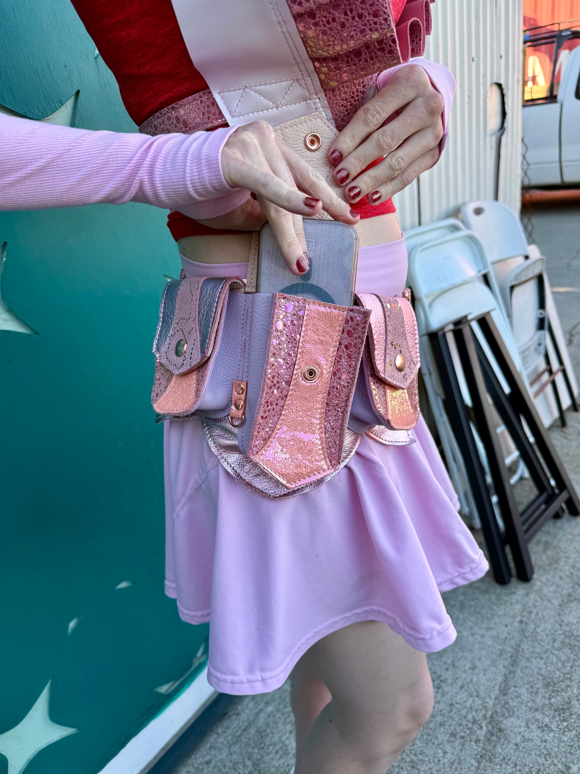 The Regal Belt is our signature utility belt ideal for adventures of all kinds from Burning Man, to Ren Faires, and Cons, to concerts, hiking, and running errands. One side has a single big pocket, ideal for a larger phone or A6 notebook, while the other side has three smaller pockets (the center one is sized for an iPhone) which can hold a variety of necessities such as card wallets, keys, earbuds, pocket knives, lip balms, etc.