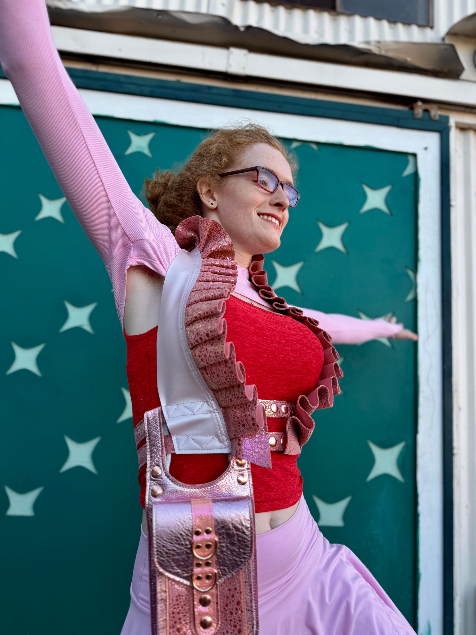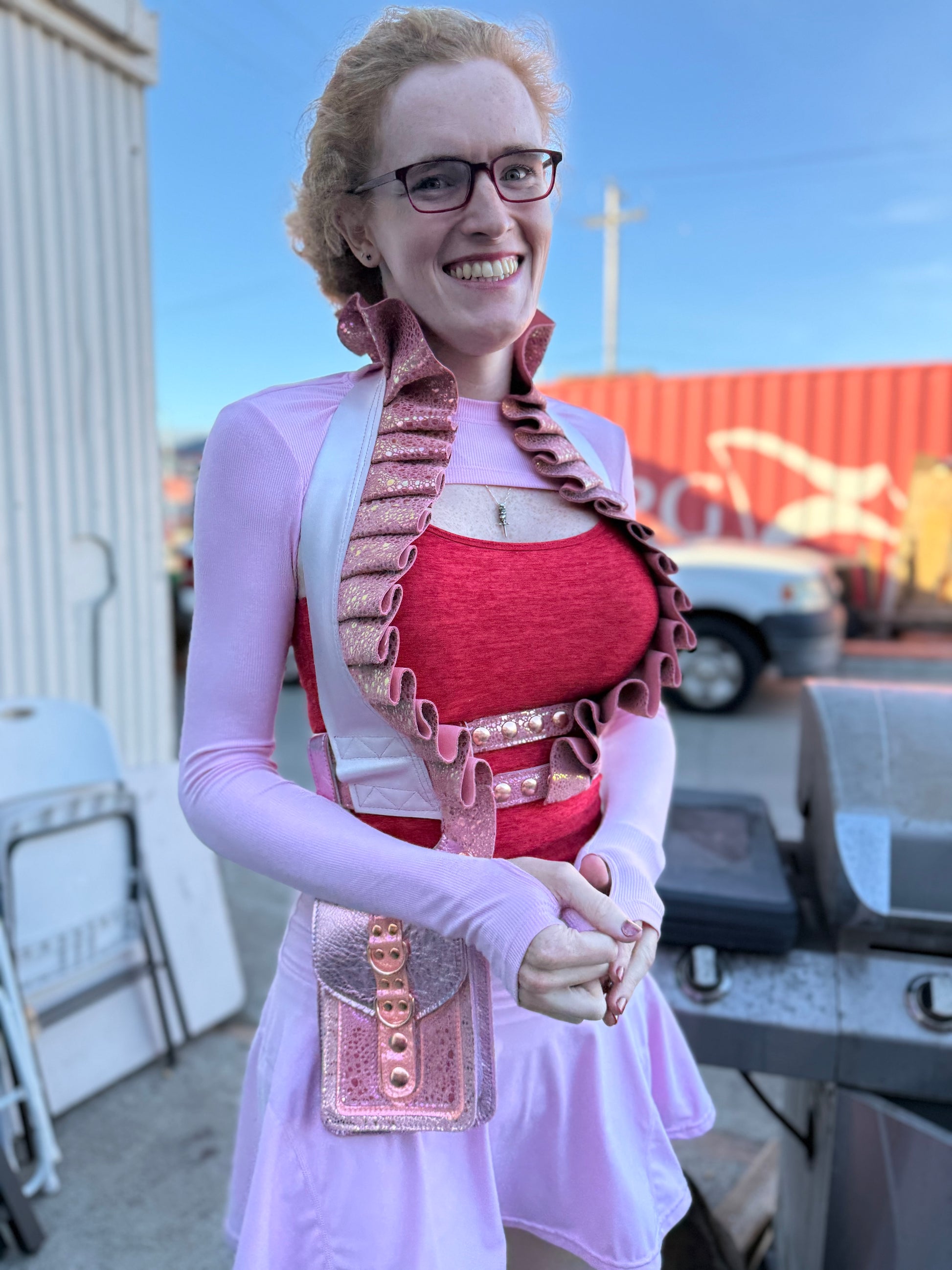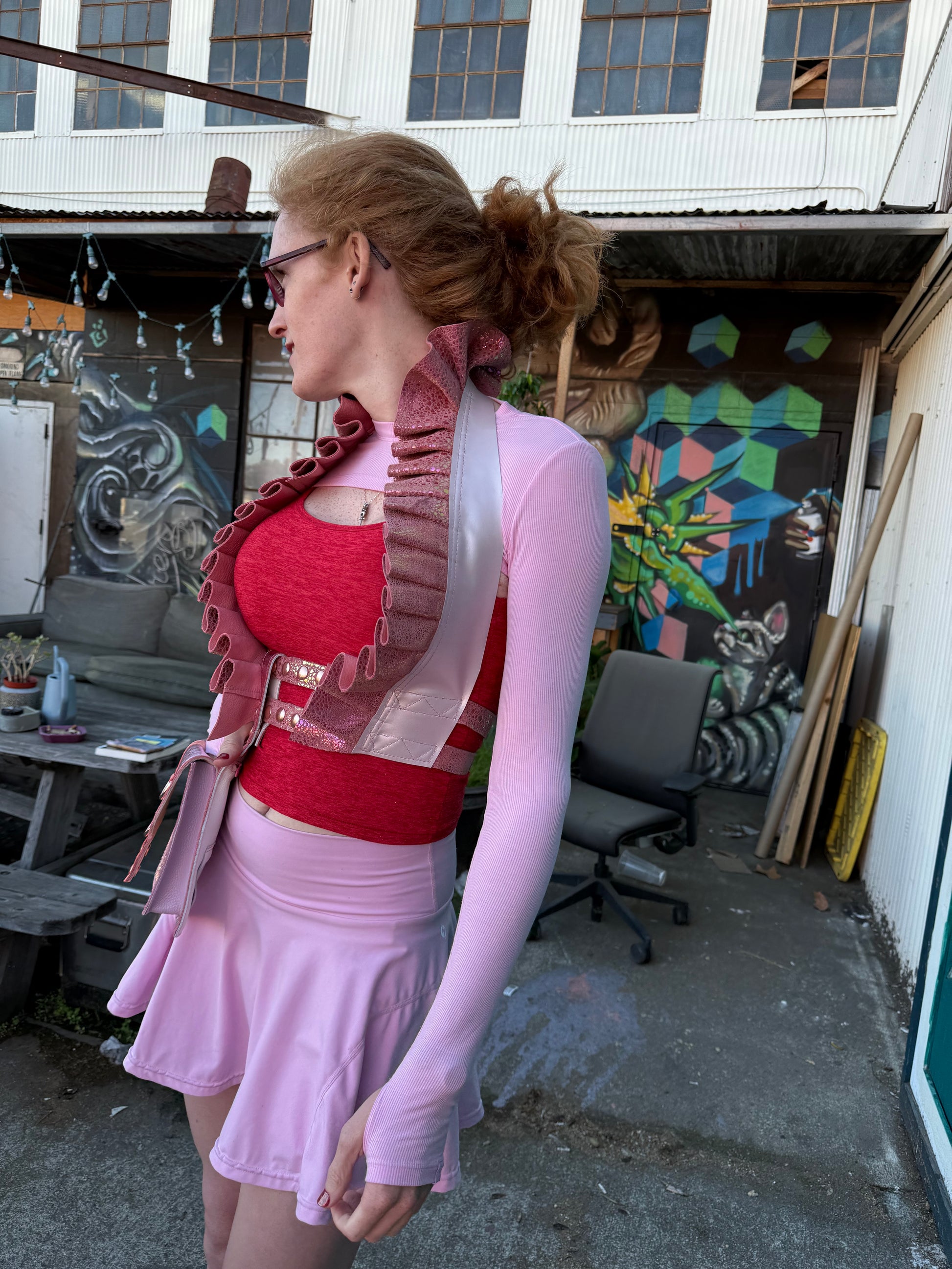 Stitched onto a Pink Pearl calfskin neck, these balletic-hued ruffs feature a top grain, foil-pressed cowhide, giving a pink-to-mint duochrome shift on a rosy, bubblegum base.