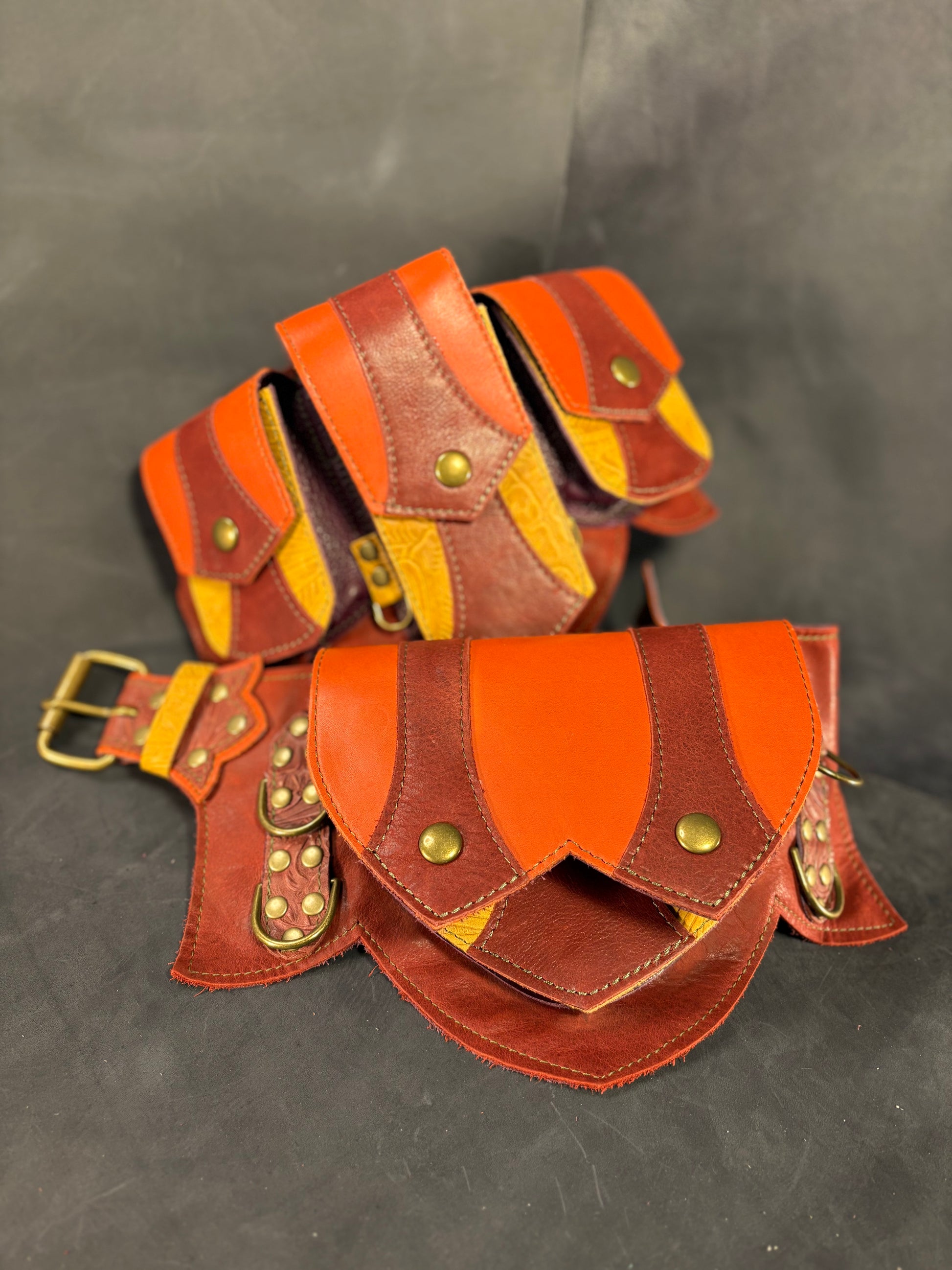 The Regal Belt is our signature utility belt ideal for adventures of all kinds from Burning Man, to Ren Faires, and Cons, to concerts, hiking, and running errands. One side has a single big pocket, ideal for a larger phone or A6 notebook, while the other side has three smaller pockets (the center one is sized for an iPhone) which can hold a variety of necessities such as card wallets, keys, earbuds, pocket knives, lip balms, etc.